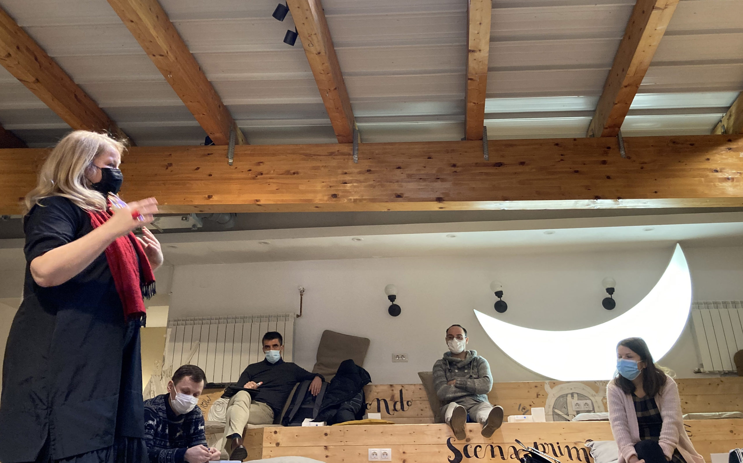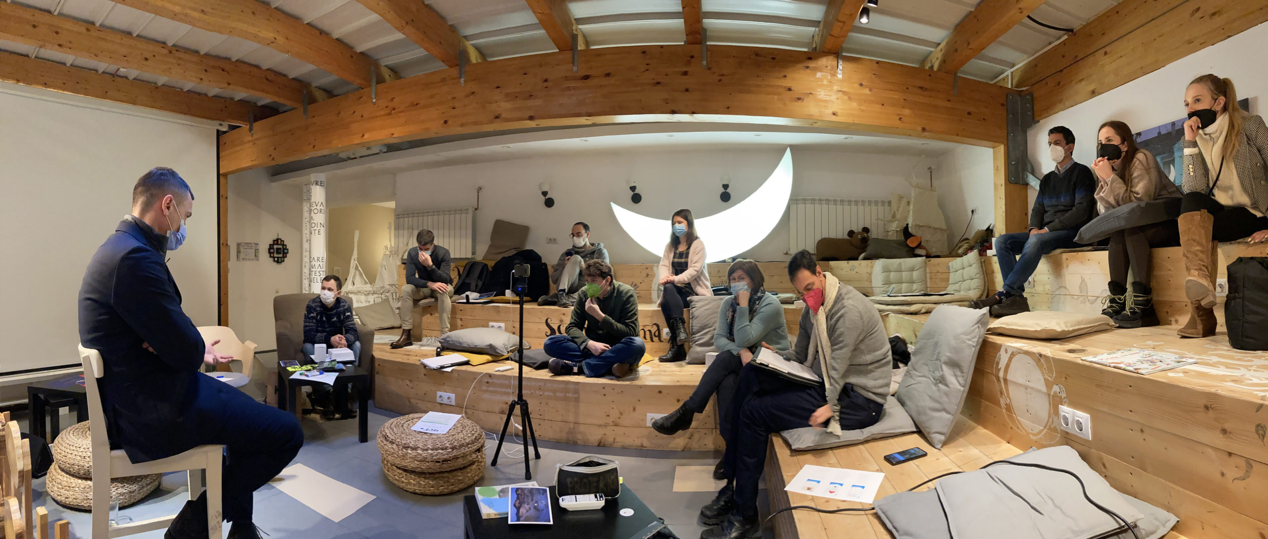 Tras una pausa de unos minutos, Anastasia nos explicó a los participantes el significado de la media luna que ilumina el anfiteatro de madera en el que estamos sentados. Es un objeto simbólico y representativo del proyecto artístico «VIAJE DE LA LUNA PRIVADA» de Séneca Anticafe en colaboración con el fotógrafo Leonid Tishkov realizado durante el verano de 2015. Esta luna recorrió 200 km pasando por los Cárpatos del Sur, Valaquia y Transilvania sacando a la luz todos aquellos lugares destruidos por la deforestación y las actividades industriales. El segundo día de reuniones y conferencias terminó con un momento de convivencia en un restaurante tradicional donde pudimos degustar rollos de carne y col acompañados de vino tinto «Negru de Drăgășani», ambos típicos de la zona de los Balcanes.